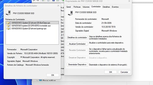 Para confirmarem qual o controlador que está em uso, basta depois selecionar o disco e ir a propriedades e ver os detalhes do controlador e irá aparece igual á imagem abaixo.