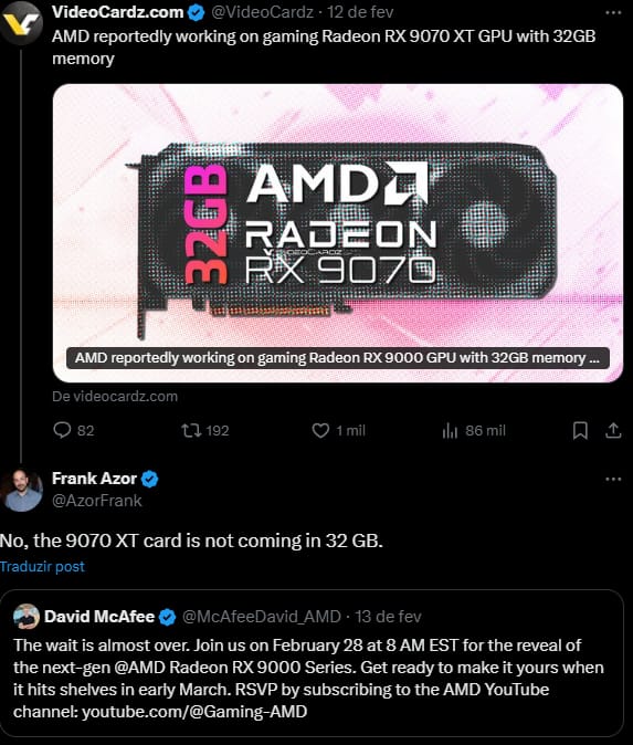 No dia 28 de Fevereiro será o evento sobre as RX 9070 Series e, passado uma semana sensivelmente estará á venda nas lojas.
