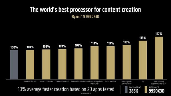 Em produtividade promete 13% de aumento médio em relação ao 7950X3D e cerca de 10% em relação ao Intel 285K.