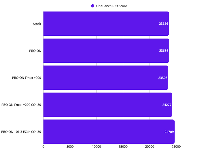 Vou deixar apenas os testes de Cinebench R23 e do CPU-Z , apenas para ter uma ideia da diferença entre stock e usando PBO ou ECLK.