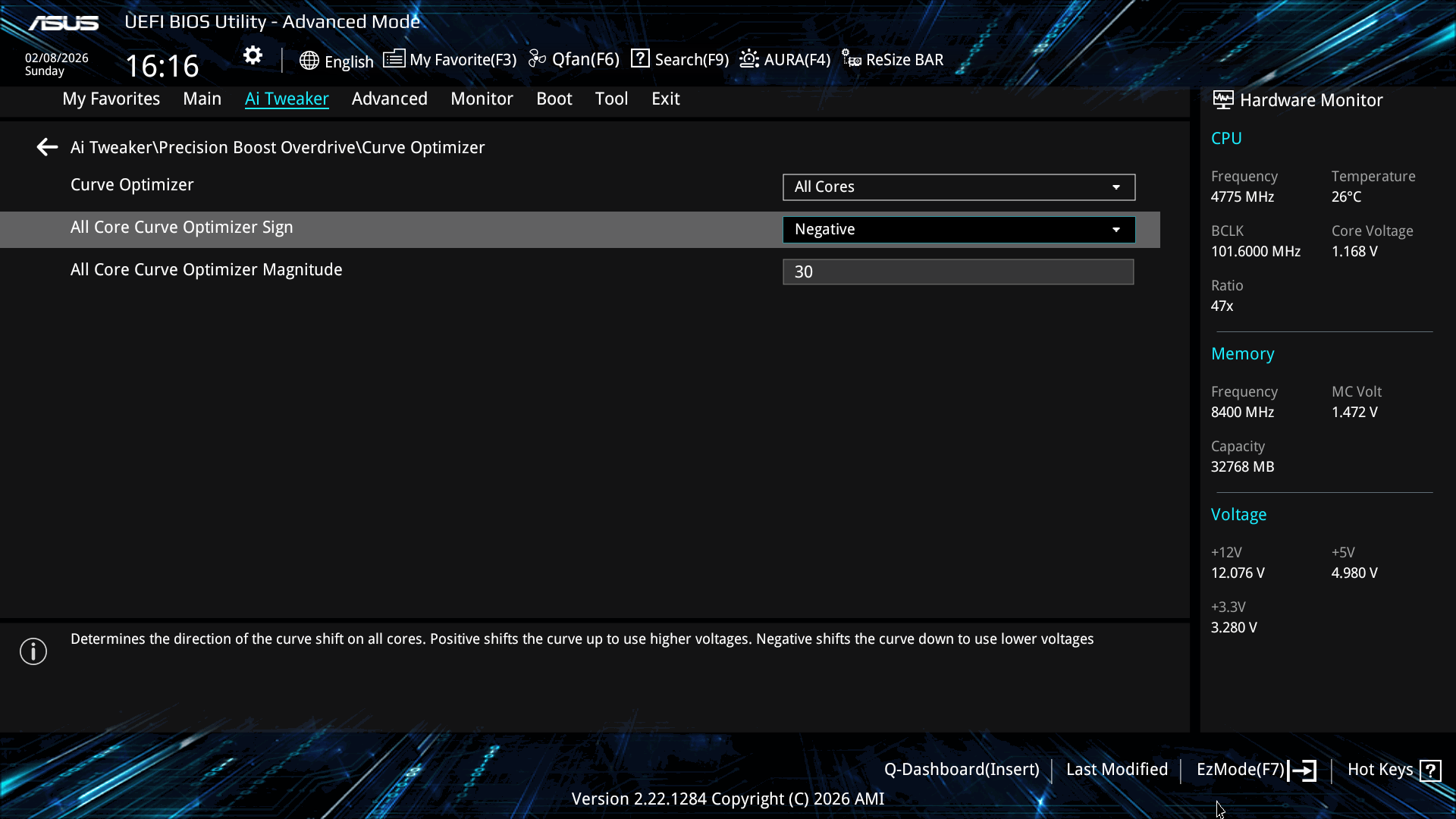 Podem começar por All Core Negative – 15 e vão testando através de programas de Stress test como o OCCT , Prime95 , Cinebench stresst , ou Corecycler de forma a testar core a core e verem se algum deles não aguenta essa valor.