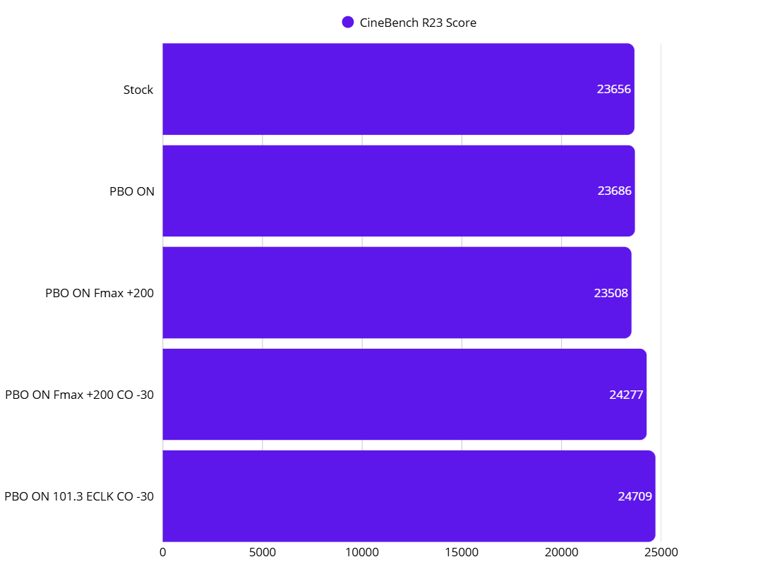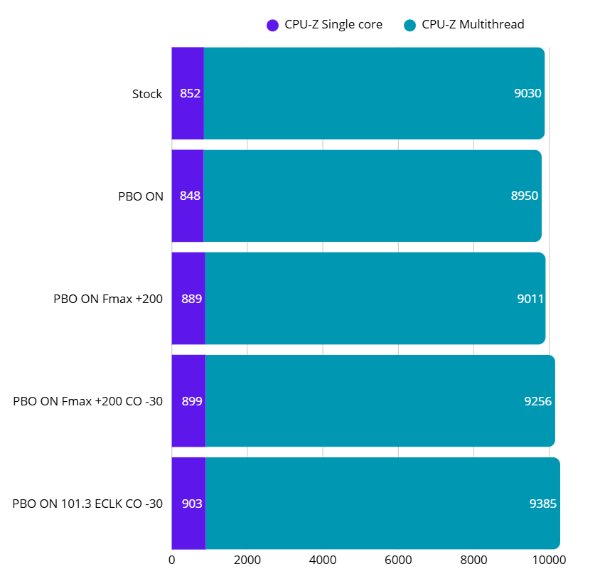 Vou deixar apenas os testes de Cinebench R23 e do CPU-Z , apenas para ter uma ideia da diferença entre stock e usando PBO ou ECLK.