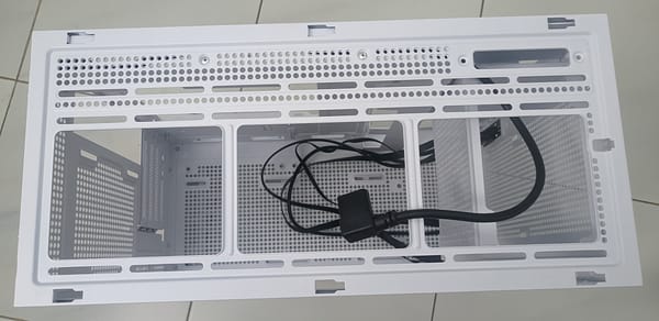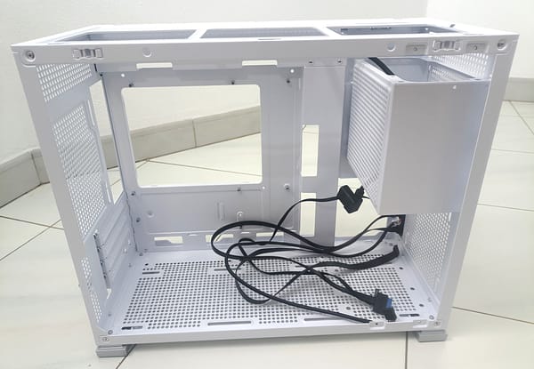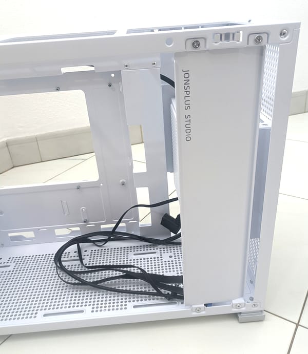 A caixa tem ainda uma chapa interior ao alto do lado do vidro, que tapa a fonte e sempre ajuda a esconder os cabos.