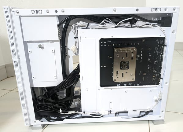 Mas claro, se foi aproveitado o espaço interior para o suporte de hardware maior, o espaço que sobrou para arrumação de cabos não será muito.