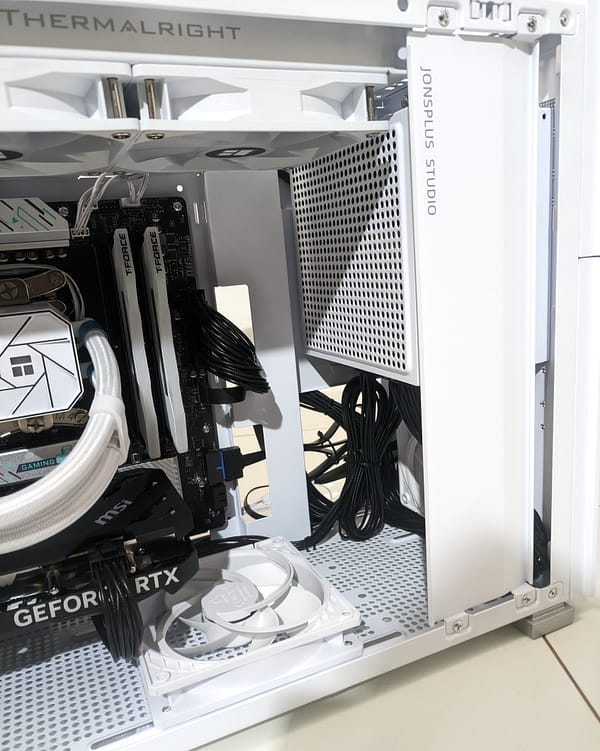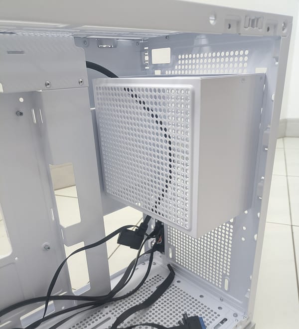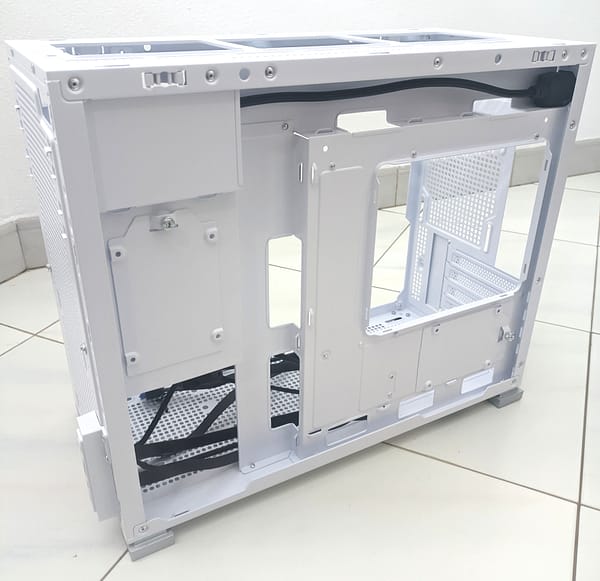 Na lateral direita, temos então algum espaço de arrumação para os cabos, podendo usar o espaço por onde está o cabo de alimentação da fonte para passar os cabos de 8Pin para o CPU por exemplo e/ou também para os cabos de ventoinhas e RGBs.