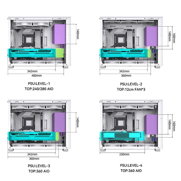 Com suporte para fontes SFX e ATX , suporte para gráficas até 400mm, mas que será limitado consoante a posição da fonte e tamanho da fonte.