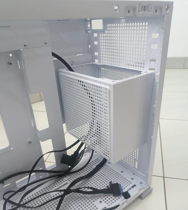 Nota: podia ser revisto numa revisão da caixa, uma chapa ou grelha também na largura, de forma a separar o espaço da fonte/cabos para o interior da caixa, dava outro aspecto e não se via tanto os cabos no interior.