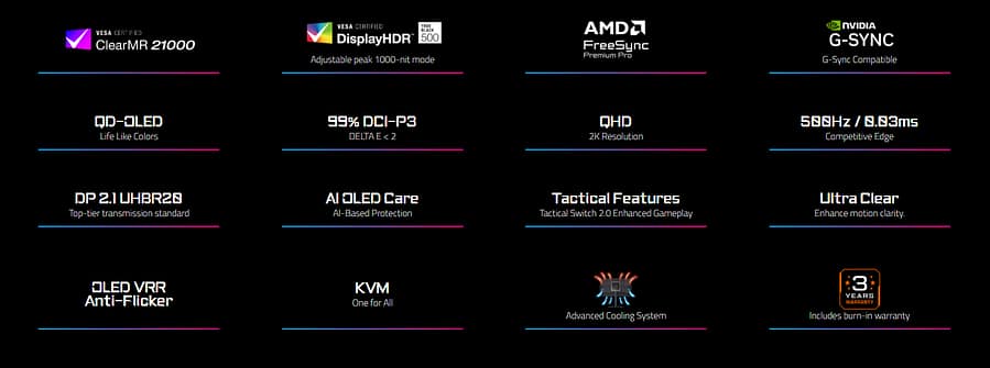 Um monitor de resolução WQHD ( 2560×1440) com painel Samsung QD-OLED com uma taxa de refresh de 500mhz, com um tempo de resposta de 0.03ms GTG.