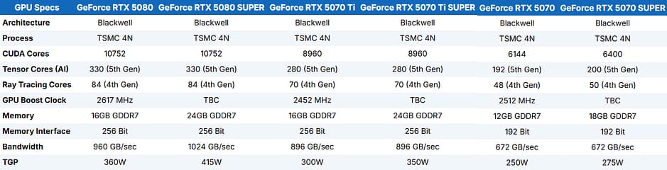 Passando a 80 Super e a 70Ti Super para 24GB GDDR7 e a 70 Super para 18GB GDDR7.