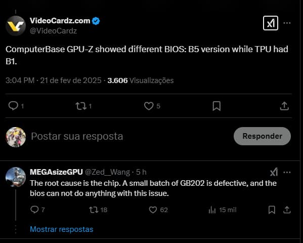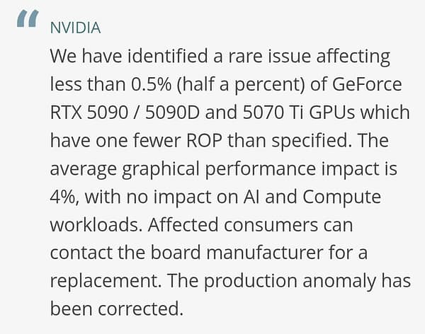 A NVIDIA confirmou esta falha, dizendo que é apenas em 0.5% das unidades de RTX 5090 e 5090D.