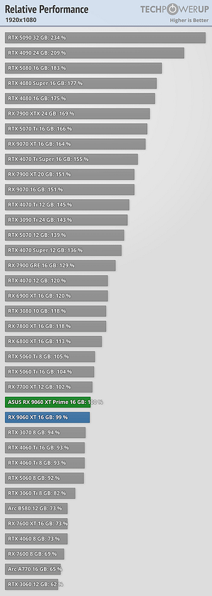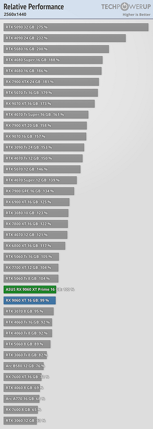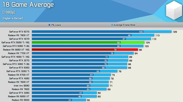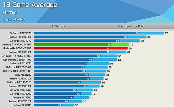 Performance idêntica á concorrente RTX 5060Ti 16GB e também idêntica á geração anterior AMD RX 7700XT mas agora com 16GB em vez de 12GB.