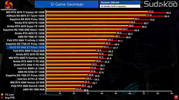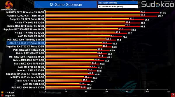 Ficando muito próximo do desempenho bruto de uma RTX 5060Ti, que tem uma MRSP de 429$ para a versão de 16GB, mas também da RX 7700XT de 12GB da geração anterior.